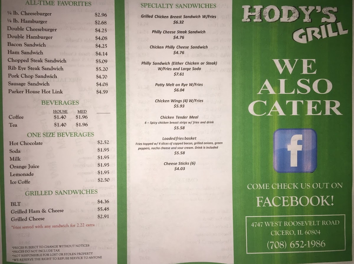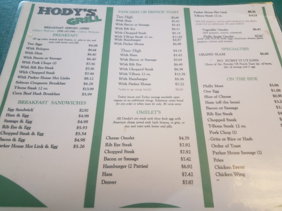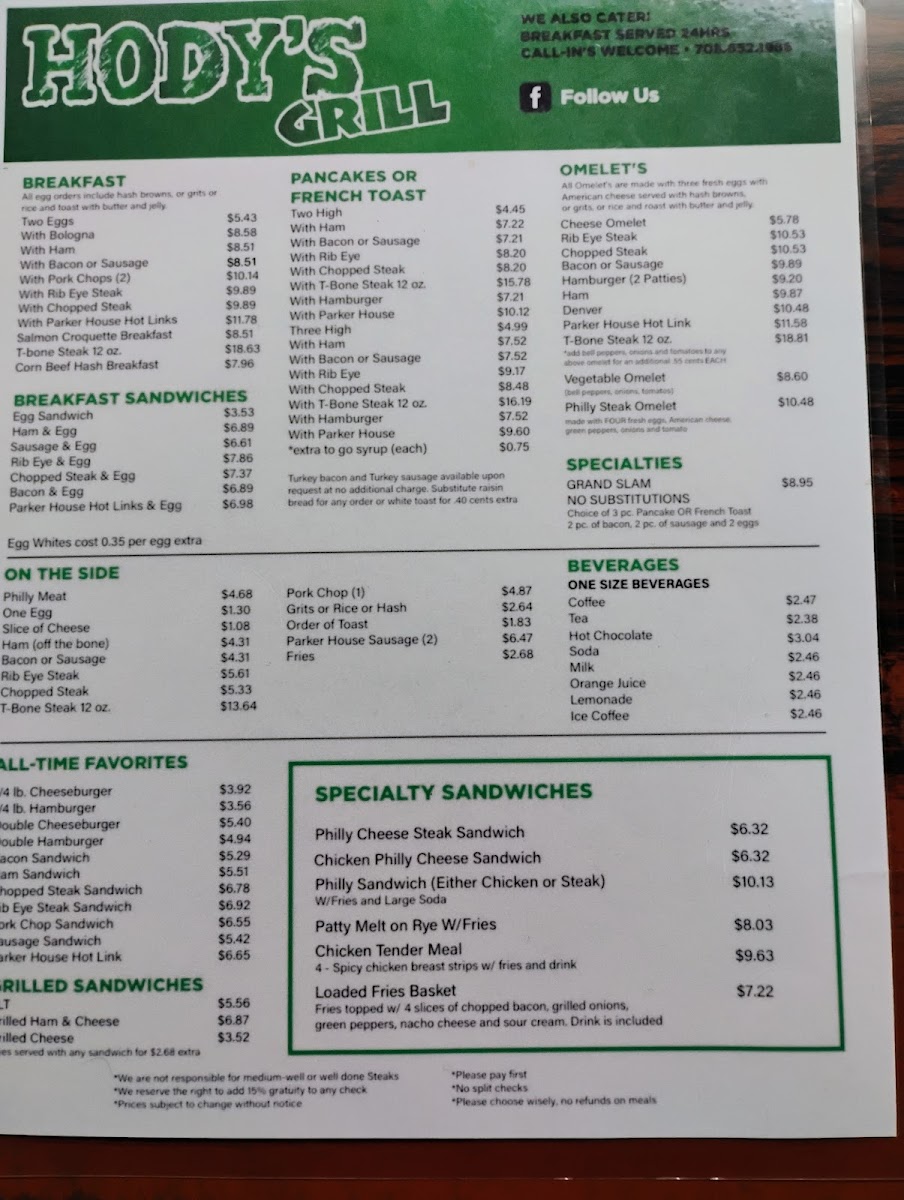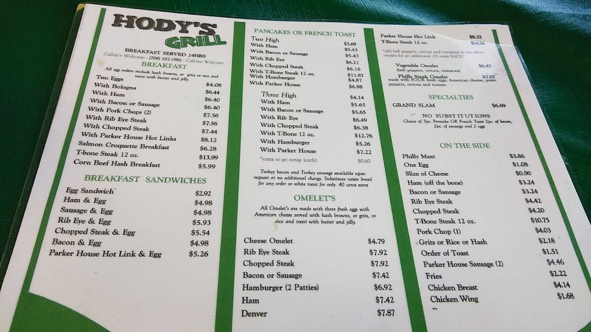 Hody's Grill offers a straightforward, comforting menu that reflects the warmth of a classic American breakfast and grill spot. The menu features hearty morning staples like scrambled eggs, corned beef hash, and the distinctive Parker House sausage, alongside satisfying midday options such as chopped steak sandwiches and T-bone steaks. Whether you’re starting your day or settling in for a casual meal, the selections here suit a relaxed and familiar setting.